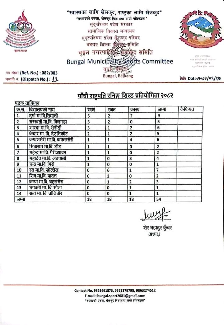 नगर खेलकुद समितिका अनुसार दुर्गा मावि सिमालीले हालसम्म ५ स्वर्ण, २ रजत र २ कास्य गरी जम्मा ९ वटा पदक जित्दै शीर्ष स्थानमा रहेको छ । त्यसैगरी सरस्वती माध्यमिक विद्यालय बिजगडाले ३ स्वर्ण र २ रजत गरी ५ पदक हात पार्दै दोस्रो स्थानमा रहदा शारदा माध्यमिक विद्यालय सैनोडीले ३ स्वर्ण, १ रजत र २ कास्य गरी ६ पदकसहित तेस्रो स्थानमा रहेको छ। यस्तै, केदार माध्यमिक विद्यालय देउलीकोटले २ स्वर्ण १ रजत, २ कास्य गरी ५ पदक, कफलसेरी माध्यमिक विद्यालय कफलसेरीले १ स्वर्ण, १ रजत र ४ कास्य गरी ६ पदक प्राप्त गरेको छ । सिताराम माध्यमिक विद्यालय डौडले १ स्वर्ण र १ रजत, महेन्द्र माध्यमिक विद्यालय गैरीज्यावनले १ स्वर्ण र १ रजत, महादेव माध्यमिक विद्यालय अठपालीले १ स्वर्ण र ३ कास्य गरी ४ पदक हात पारेको छ।